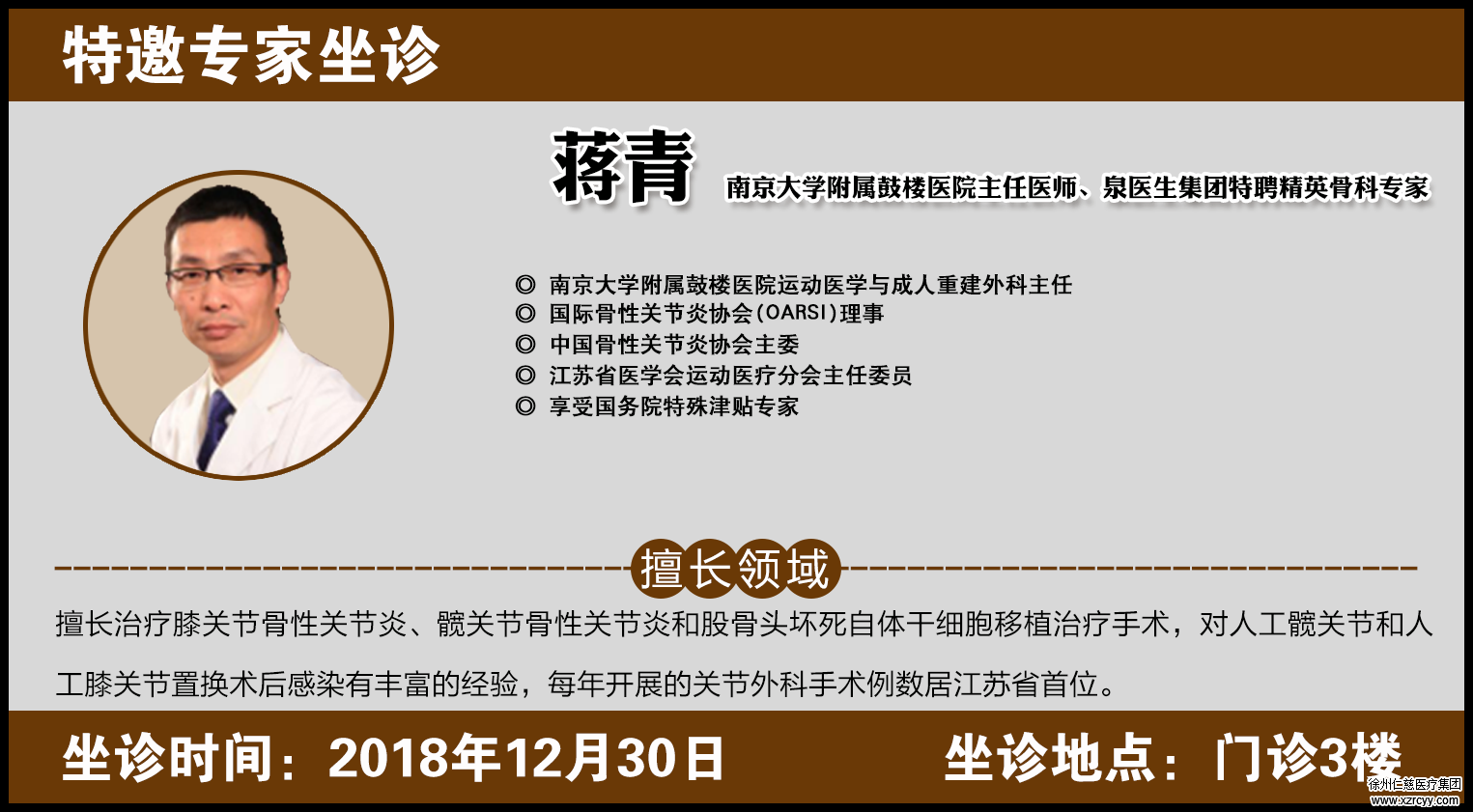 此次,蒋青教授只停留一天,上午坐诊,下午为关节病疑难患者手术。有膝关节骨性关节炎、髋关节骨性关节炎和股骨头坏死等患者请提前预约,预约电话:关节科蒋主任15852110595,0516-87328999,将有机会获得这位著名骨科专家的诊疗服务。
