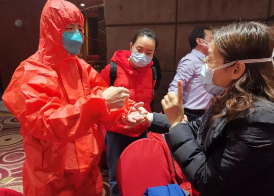 ▲ 茅一萍(右一)给江苏医疗队队员进行感控培训