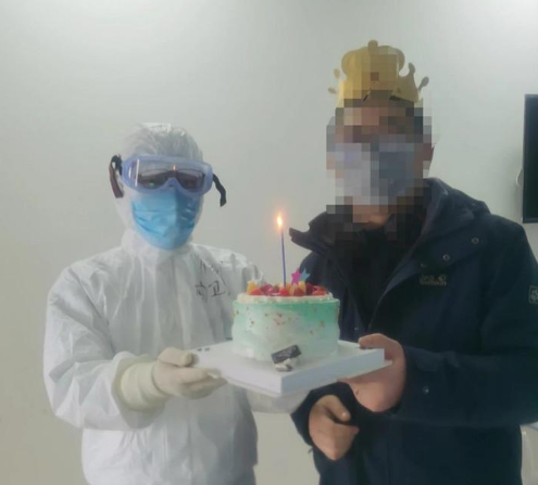 伴随着杨卫东和同事唱起的生日歌,摆有蛋糕的治疗车被缓缓推入隔离病房。正在与家人通话的张先生惊喜到呆住了,兴奋的他让视频对面的妻子和孩子看看医护人员给他买的蛋糕。