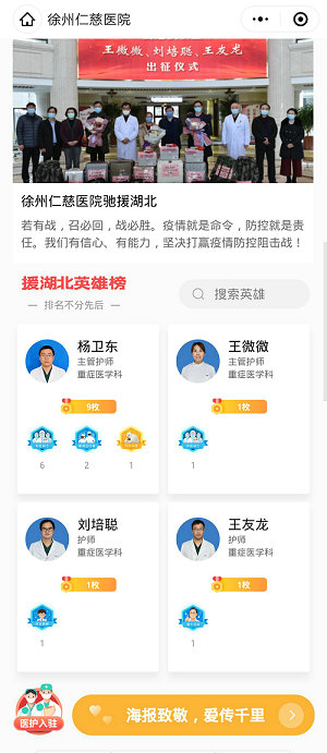 活动将为每个省,每个医院,每个队员设立独立的小程序卡片,目前江苏省援湖北医疗队队员及队员所属医院已经入驻平台,大家可以扫码或在微信小程序搜索蝴蝶健康进入主页认识英雄,了解英雄,为英雄们加油打气,与英雄们互动交流。