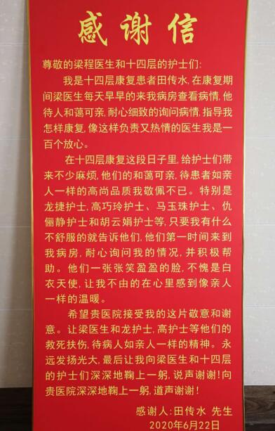 6月26日上午,betway在线登陆康复医学科的患者田传水在出院前给科室送来了一封特殊的感谢信,这封信上提了很多名字。