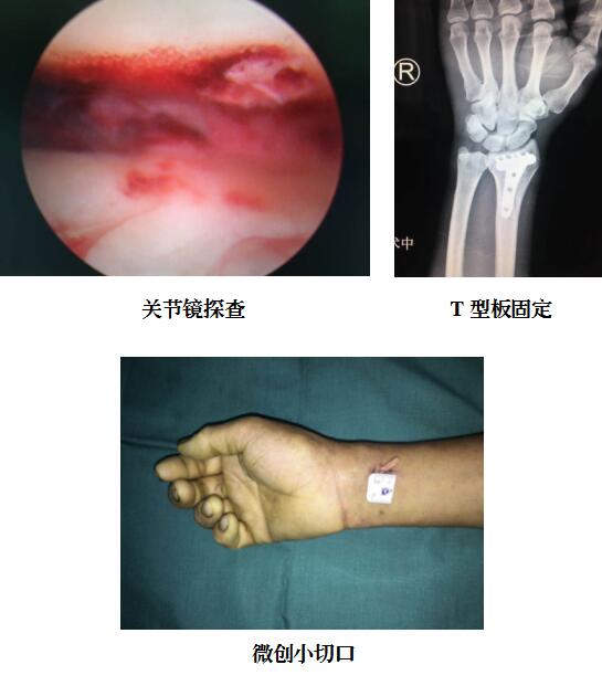 7月7日,一切准备就绪,齐主任团队为刘先生进行了“关节镜辅助下右桡骨远端骨折复位内固定术”。术中牵引复位右桡骨骨折端,切开0.5厘米皮肤,关节镜探查见骨折对位、对线好,予克氏针固定。沿右桡侧腕屈肌腱做一约1厘米切口,牵引桡侧腕屈肌腱,放置T型板,打入螺钉固定,缝合伤口,手术顺利完成。