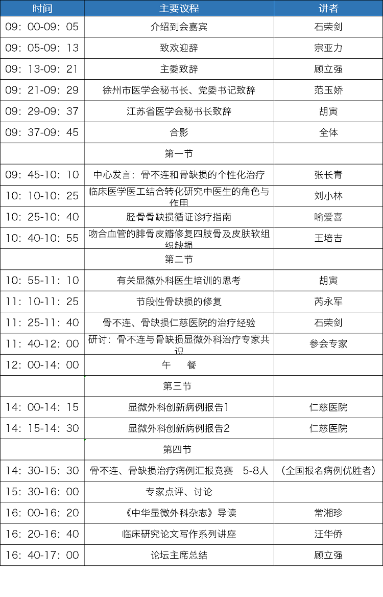 值得期待的是,本次论坛上,一批显微外科专家将就“骨不连、骨缺损治疗”专题讨论,张长青教授作中心发言:《骨不连和骨缺损的个性化治疗》,刘小林教授将作《临床医学医工结合转化研究中医生的角色与作用》发言,喻爱喜教授将作《胫骨骨缺损循证诊疗指南》发言,王培吉教授将作《吻合血管的腓骨皮瓣修复四肢骨及皮肤软组织缺损》的探讨,芮永军教授将作《节段性骨缺损的修复》的发言等。
