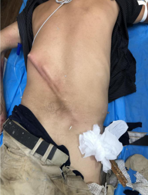 2020年3月29日,徐州丰县一男子在家干活时不慎从2米高的地方跌落,被约1.2米长的铁撬棍从肛门插入,插入长度约1米,当时家属帮助其拔出撬棍,并立刻拨打了120电话,前往我院接受治疗。急诊CT显示患者胸腹贯通伤、肛门开放性损伤、右肺贯通伤、右侧血气胸、直肠破裂等多处损伤,情况非常危险。普外科医生团队为其进行了6个小时手术,术后患者转入ICU,平稳度过危险期。