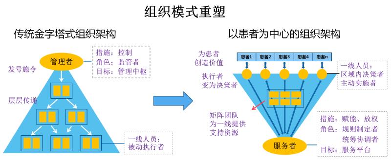 第四,医疗是知识密集型行业,医务人员是“知识管理者”。救死扶伤是医务人员的天职,患者生命相托,我们要以价值医疗服务我们的患者,沟通和爱心尤为重要,就像美国著名医生特鲁多博士墓志铭所写“有时去治愈,常常去帮助,总是去安慰”。医务人员是知识管理者,需要自由、空间、创造力,而传统的医院管理模式是自上而下、层层控制的模式,压制了知识管理者的创造力,导致“一切以患者为中心”只是一个口号,这需要通过组织模式重塑来实现。未来雇员时代将消失,传统金字塔式组织架构向以患者为中心的组织架构转变,知识管理者由雇员关系变为伙伴关系,管理者变为服务者,一线人员由被动执行者转变为决策者,才会释放出更多的创造力,让听得到枪炮声的一线人员快速反应做决策,真正实现“一切以患者为中心”的理念。