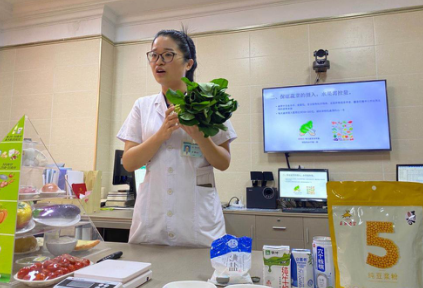 为了让患者清楚了解一天中蔬菜的摄入量,苗医师亲自买了一斤青菜交到病患手里感受这一斤的量,让患者加深每日对蔬菜摄取量的认知。还购买了酸奶、纯牛奶、鲜牛奶、奶粉、核桃露,一一展示商品上的营养说明,告诉患者在众多奶品中选择哪种奶品营养成分最高。通俗易懂的语言加上食品实物的演示,患者及家属拍照转发获得一致好评。