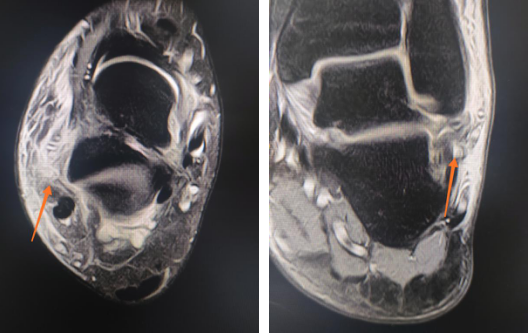 患者15岁,蹦下楼梯时扭伤右脚踝,导致右外踝骨折,右外踝关节侧副韧带断裂。