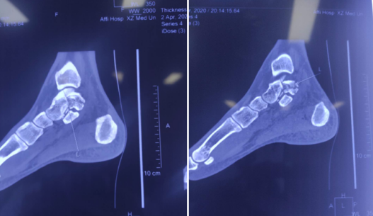 患者为12岁男孩,从高处坠落,导致跟骨粉碎性骨折。