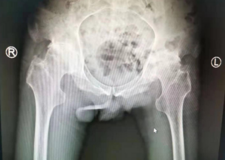 关节科蒋守海主任给吕师傅做了检查,吕师傅的左右髋关节内收外展、内外旋均不能;由于长时间坐轮椅,吕师傅的下肢肌肉已经开始萎缩,左下肢比右下肢短2厘米,摄片显示双侧骨头密度增高,双髋关节间隙狭窄,双髋臼缘及股骨近端见骨质增生,诊断为双侧股骨头无菌性坏死,强直性脊柱炎,左股骨近端陈旧性骨折。患者才32岁,如果要挽救髋部功能,必须进行髋关节置换手术。