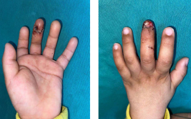 经过一段时间的恢复,洋洋的左手中指再植成活良好、外形如初,现已拆线出院。