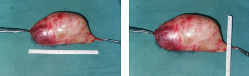 次日,手术按时进行,术中探查见肿物与臂丛神经相连,上肢的一些主要的动、静脉都在肿物的下方。手术风险性非常大,稍有不慎,就会损伤血管造成大出血的状况,且难以修补。术中按照术前拟定的手术方案,采取锁骨上、下切口,通过锁骨下隧道方式仔细剥离肿物上神经束,术中见神经瘤与神经粘连严重,予以松解,于锁骨上下切口内采取“会师法”将神经瘤完全剥离。经过4个小时的努力,手术顺利完成。取出的肿物经过测量,大小约12cm×6cm×5cm,竟然比一个拳头还要大。