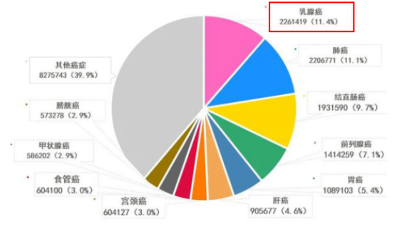 根据世界卫生组织国际癌症研究机构(IARC)发布的2020年全球最新癌症负担数据,乳腺癌取代肺癌,成为全球第一大癌症。目前已知的造成乳腺癌的原因有月经初潮早、绝经晚、哺乳时间短、未婚育、乳腺癌家族史、口服避孕药、肥胖和高脂肪低纤维饮食、吸烟、熬夜等。