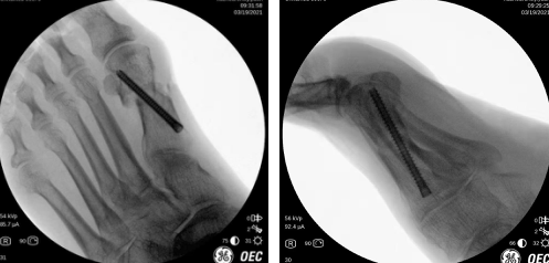 第二天,徐明亮主任周祥国医生团队为患者进行了微创踇外翻手术,手术仅花了30分钟就顺利完成。术中,手术医生切开0.8厘米小切口,采用低频超声骨刀清理骨赘,外移截骨,进行螺钉内固定,切口做了细致的美容缝合,几乎看不到。