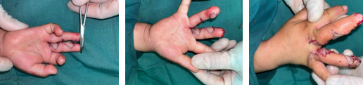 家长们可能觉得奇怪,创面是哪里来的呢? 手指分开后手指侧面会留有创面,创面的覆盖多半是要靠皮片移植来修复的。用于移植的皮肤多来自患儿的腹部,因为此处比较隐蔽。