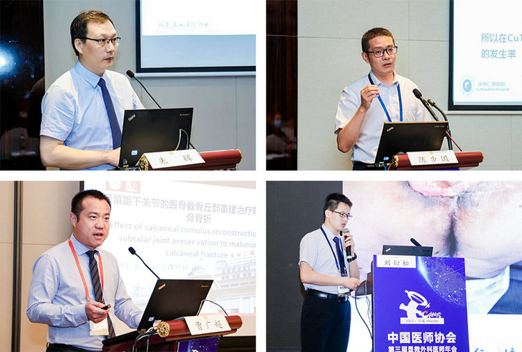手外科朱辉主任作《软组织平衡在Wassel IV—D型复拇畸形中的应用》的发言;手外三陈步国主任作《前臂内侧皮神经在肘管区域的解剖观察》的发言;足踝一曹广超副主任作《陈旧性跟骨骨折的治疗》的发言,并在大会分论坛担任主持;创面修复科曹天勇医生作《臀部压力性损伤治疗的得与失》的发言,向同行们展示了我院手外、足踝、创面修复科在显微外科领域的学术与技术实力。