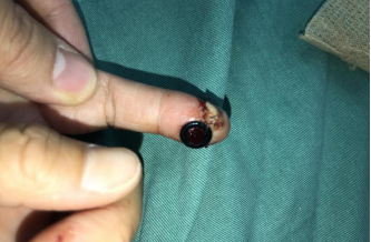 术中探查见张女士的左示指指固有动脉已经破裂,桡侧指固有神经也已经断裂,远节指骨骨折。术中取下纽扣,复位骨折的指骨,缝合血管神经后松止血带,一次性通血成功,手术顺利结束。
