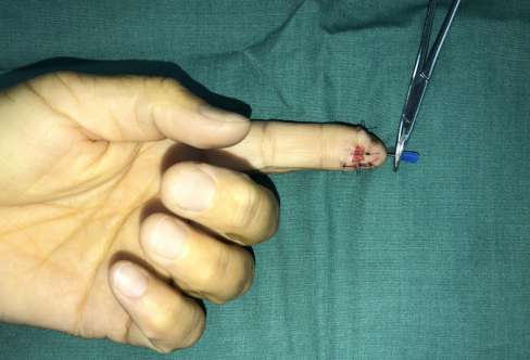 术中探查见锚钉卡压了中指两侧指固有动脉及指固有神经,指深屈肌腱还有部分断裂。吴医生手术团队小心地取出锚钉,缝合了断裂的神经和血管,松止血带后见血管通畅,指端变红润,再缝合皮肤,结束手术。
