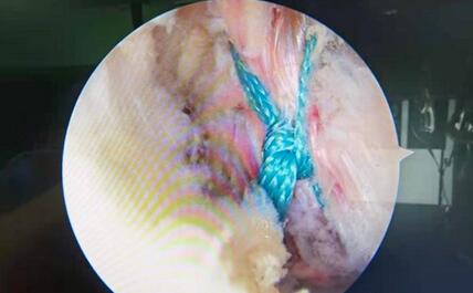 手术开始,术中3D-C臂扫描采集数据,三维重建骨折位置及形态,天玑骨科机器人规划骨隧道位置,自动完成进针导向器定位。主刀医生张主任沿导向器打入导针,关节镜下再次验证导针位置满意,建立骨隧道,非可吸收线“R”形捆扎后交叉韧带止点部,复位骨折端。后交叉韧带位置,走形,张力均满意。