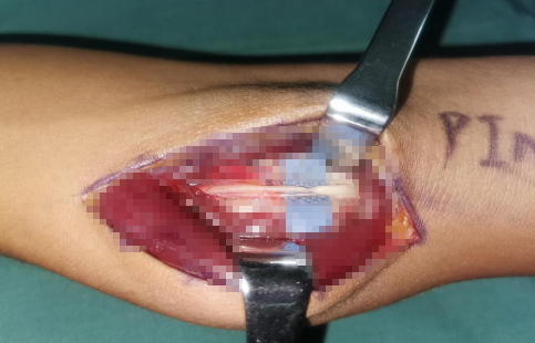 手外三病区陈步国主任接诊后,详细询问了马先生的病史,安排马先生做了上肢全面的专科查体及肌电图、肌腱超声检查。得知患者3月前有呼吸道感染病史,查体发现患者左腕背伸功能正常,左手各指背伸不能。结合肌电图、神经超声检查,陈步国主任初步诊断为:左前臂桡神经病毒性神经炎。考虑患者3个月的保守治疗未见改善,神经没有恢复迹象,同时患者年轻,有着强烈住院手术要求。马先生办理了住院手术治疗,第二天手术顺利,术中见桡神经深支在前臂近端3cm处呈典型“沙漏样”改变或者“腊肠样”改变。修复神经外膜,神经不连续存在,在缩窄处切除约3mm神经,在显微镜下重新吻合。患者术后满意,手指背伸较前改善。
