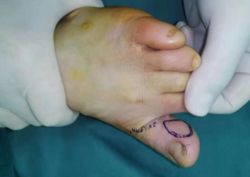 很快,滕医生手术团队为李先生进行了“右示指清创游离拇趾腓侧皮瓣修复创面术”。术中测量右示指指端缺损面积约2cm×1cm,从左拇趾腓侧取游离皮瓣面积约2cm×1.5cm,覆盖受区,吻合血管、神经。手术顺利。