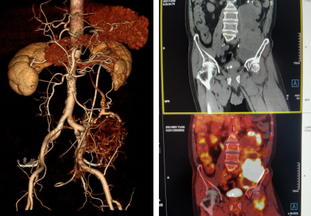 术前腹腔血管CTA(图左)、PET-CT(图右)