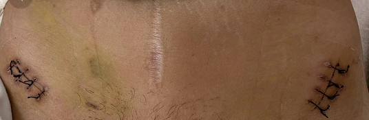 经充分术前准备并与患者沟通,任海东、信远、吴学业医疗团队对患者实施了微创手术,用时30分钟便成功完成了手术,仅2个3cm左右的手术切口,出血量非常小。术后第二天,患者能够在床上坐起,功能恢复良好。患者术后4-7天即可安排出院。