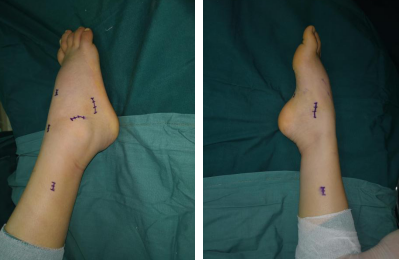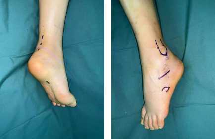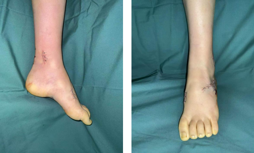 2022年1月,父母带着周周再次来院,希望曹主任手术团队为女儿进行左足的矫形手术。曹广超、李亮、王岩岩手术团队为周周进行了“左马蹄高弓内翻足畸形矫正术”。因周周双足情况不同,本次手术主要进行跟腱、跖筋膜胫骨、胫骨后肌、趾长伸肌延长,第1趾骨抬高,趾长伸转位,腓骨肌加强等操作。