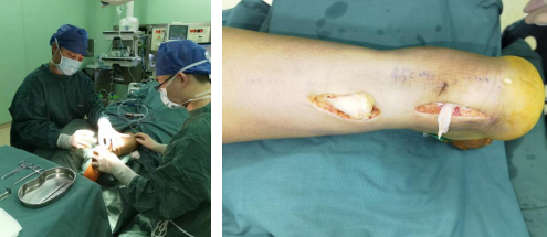 刘阿姨入院后,石荣剑副院长、徐明亮主任主持进行了术前讨论,拟定了手术方案。石院长主刀,对刘阿姨进行了右跟腱V-Y延长修复+拇长屈肌腱转位加固、重建术,手术顺利。术后刘阿姨修养一个月左右的时间后再进行功能锻炼,目前右足行走功能逐渐恢复。