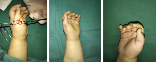 III型和IV型手术操作首先切开皮肤、皮下并切除多余骨骼并彻底切除异常形态骨骺,保留侧副韧带、肌腱、部分皮肤组织瓣。次日手术团队为患儿进行“双手拇指多指切除、截骨矫形、肌腱韧带松解重建+带蒂筋膜瓣修复术”,手术十分顺利,术后患儿恢复良好出院。