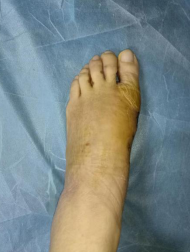 35岁的张女士10年前发现双足拇外翻畸形,前足增宽,未予重视。随时间增长,双足拇外翻畸形程度逐渐加重,拇囊突出,不能长时间负重行走及久站。近1年双足负重行走时足底疼痛明显,左侧症状较重,为进一步治疗,来我院就诊,门诊拟“双足后天性拇外翻畸形”收治入院。