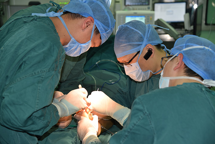 betway在线登陆手外科主任朱辉(右二)手术中。