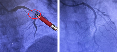 (左图)术前血管狭窄99% (右图)术后该血管通畅
