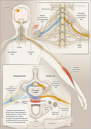 针对中枢损伤后的偏瘫患者,专家学者们经过艰苦探索后,复旦大学附属华山医院的徐文东教授等通过手术将双侧颈七神经在颈部进行左右交叉移位,人为地搭建了一条连接瘫痪肢体和同侧健康大脑半球的“直接通道”,实现了“一侧大脑从同时支配双侧手部功能到支配双侧上肢整体功能”的跨越。通过“左右颈七神经交叉移位”显微手术,使“一侧健康半球在支配对侧健康上肢时,也支配同侧瘫痪上肢”,从而开辟了“通过外周功能的改变治疗中枢损伤”的新领域。简单地说,就是将健侧上肢颈神经移位至瘫痪侧的颈神经,避开损伤侧大脑半球,让偏瘫上肢与同侧健康大脑半球相连接,激发健康大脑半球的潜能,使健侧大脑半球同时控制双侧上肢,促使瘫痪上肢恢复功能。