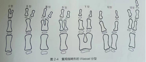 拇指多指的分类,目前采用以解剖形态异常为基础的Wassel分类法,共分为7型。其中IV型和II型在临床上较为常见,VII型最不常见。