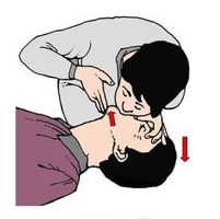 开放呼吸道(畅通呼吸道)如有呕吐物、泥沙、血块、假牙等呼吸道异物应立即用纱布包住示指伸入口腔进行清除。轻轻后仰患者头部,并牵拉下颌。看、听并感觉呼吸的存在时间5~10秒。 如果患者没有呼吸立即开始人工呼吸。观察每次人工呼吸后胸部的抬高。如果使头部过度后仰或后仰程度不够均将不足以充分开放气道。