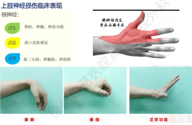(1)运动功能障碍:不能伸腕、伸指(垂腕、垂指畸形),严重时不能伸肘关节。