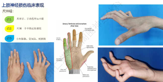 (1)运动功能障碍:不能屈曲环、小指,(爪形手畸形)