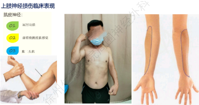 (2)感觉功能障碍:前臂外侧感觉麻木。