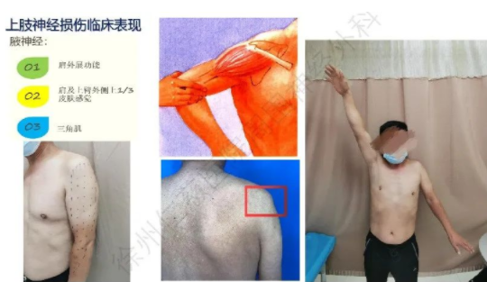 (2)感觉功能障碍:肩部、上臂近端外侧感觉麻木。