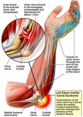 肘管综合征表现为中年男性,肘关节屈伸受限,环小指麻木,严重时手内肌萎缩,爪型手畸形,上述问题多为肘管综合征,是尺神经在肘部出现了卡压。出现持续性的麻木及手部肌肉萎缩一定要及时手术治疗。