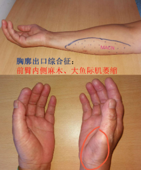 胸廓出口综合征则会表现为,患肢酸痛不适、无力、怕冷、麻木,手尺侧及前臂内侧感觉障碍,手指分开合拢无力,精细动作受限,手内肌萎缩。
