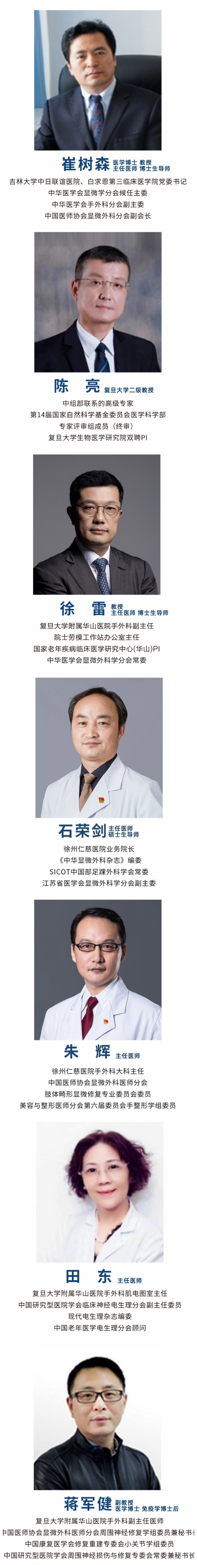 本次论坛特邀吉林大学中日联谊医院崔树森教授、中山大学附属第一医院朱庆棠教授、复旦大学附属华山医院陈亮教授、复旦大学附属华山医院徐雷教授、复旦大学附属华山医院田东教授等十余位大咖参会,并邀请国内知名骨科、手外科、显微外科专家出席会议并作专题学术讲座,介绍近年来臂丛及周围神经损伤方面的新技术和新成果。