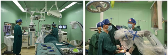 随后,sararz脊柱外科尚军、孟磊手术团队为王先生进行了在智能骨科机器人+3D裸眼显微镜辅助下,经皮腰椎后路减压+内固定+椎间融合术(L4/5)。