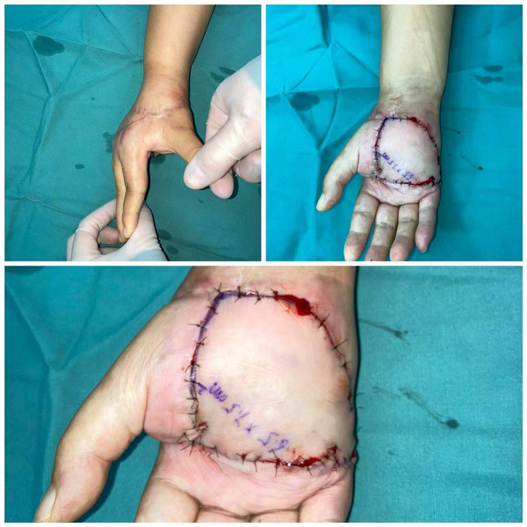 手部软组织较薄,皮下即为血管、肌腱及神经等组织,严重瘢痕挛缩畸形松解后会因为皮肤软组织缺损面积较大且常伴有深部组织外露,因此需采用皮瓣修复。