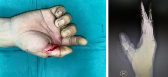 急诊科医生检查发现,李叔的右拇指近节掌背侧各可见斜行开放性伤口,创缘不齐,呈撕脱状,深及骨质,内见骨折断端外露,需要立刻治疗,不然被污染的伤口暴露久了可能会影响后期功能的恢复。于是完善相关检查的同时立即联系值班的显微修复重建外科医生准备进行手术。