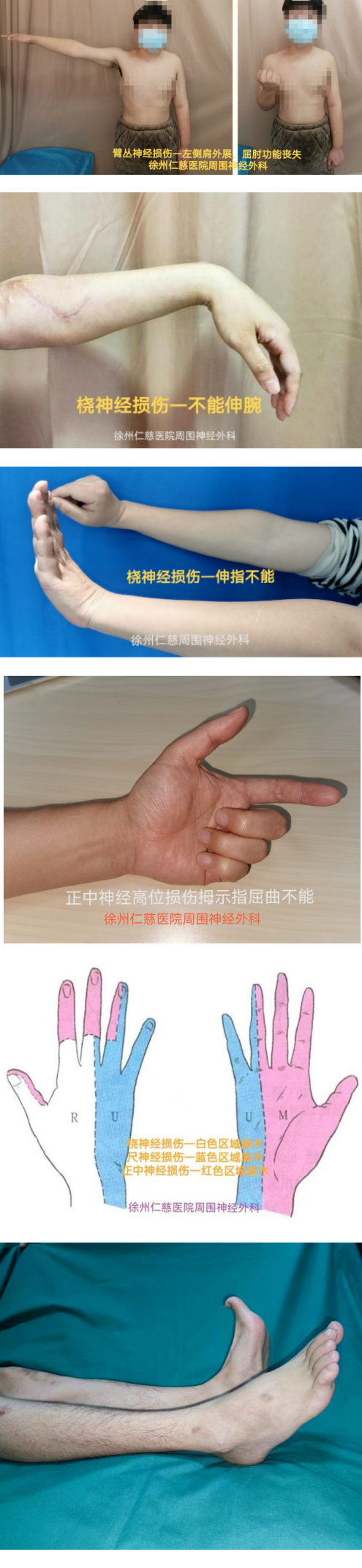 臂丛、腰骶丛及四肢神经损伤导致的肢体麻木、疼痛、肌肉萎缩、功能障碍,根据损伤程度不同有以下临床症状: