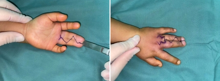 并指分指手术虽然并不复杂,但术中需要特别考虑美观性。为了达到这一目的,滕道练医师在设计手术方案时,采用了背侧切取双翼皮瓣重建指蹼的方法,这种方法可以有效避免瘢痕爬行。同时,掌面及背侧采用锯齿状Z字形切口,这种设计可以减少瘢痕挛缩。在手术过程中,滕道练医师还去除欢欢的部分脂肪进行减容,使手指更加美观。虽然术后仍存在少许皮肤缺损,但通过在手部小鱼际处取皮进行修复,皮肤质地良好,修复效果显著。