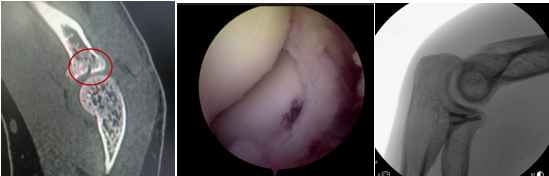 通过肘关节镜微创手术,胡俊生副主任医师手术团队为小杨进行了关节镜辅助下左桡骨小头骨折复位内固定术,探查发现桡骨小头关节面骨块碎裂,骨折断端周围散在血凝块,仔细清理后在镜下复位后固定,仔细清理完周围滑膜组织后手术顺利结束。