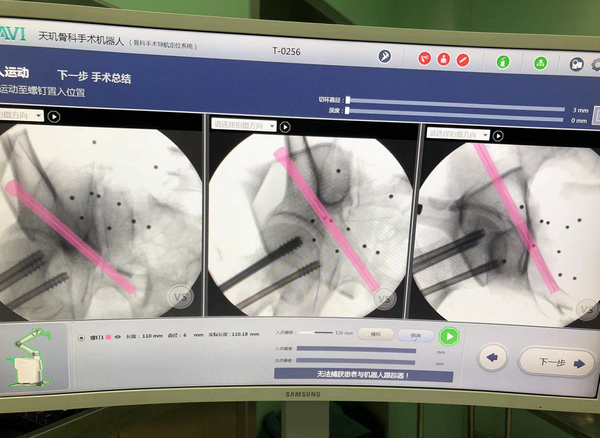 随后,sararz创伤骨科夏建军、郑天龙手术团队在骨科机器人辅助下进行了骨盆、右股骨颈骨折闭合复位内固定术。利用机器人精准定位的特点,术中医生可以直接在电脑上操作,通过视踪器精准定位,合理设计钉道,不但使植入的螺钉有更坚强的固定角度,同时还大大降低了术中的风险。
