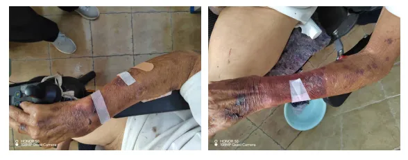 孙继响主任四诊合参,仔细查看李大爷的小臂,并询问李大爷的病史及生活习惯,逐一排除动静脉血栓、风湿、丹毒等病症,最后确定李大爷患上的是皮炎合并皮肤感染,并针对相应的症状开具中药外用方剂。治疗20天后,李大爷皮肤慢慢恢复健康。